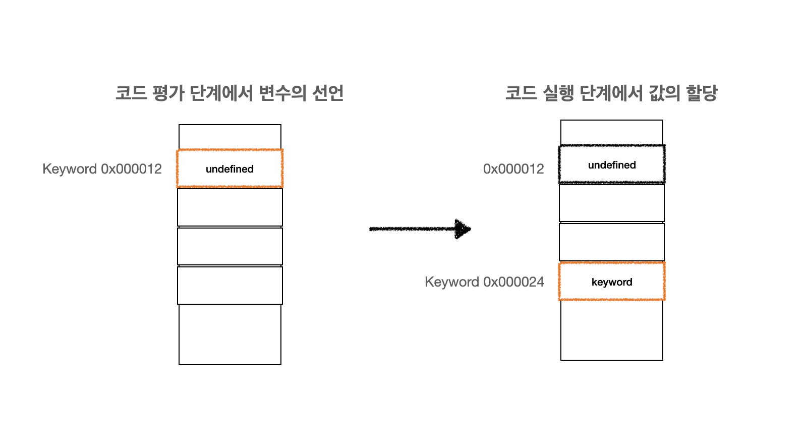 위 예제 코드를 살펴보면 첫 번째 로그로 undefined가 출력된다. 자바스크립트가 실행이 되면서 코드의 평가 단계에서 keyword라는 변수의 선언을 실행하기 때문이다. 평가단계에서 변수가 선언이 되었으니 keyword라는 변수를 참조할 수 있고, 암묵적으로 바인딩 된 undefined를 출력한다. 그 이후에 실행 단계(런타임)에서 keyword의 값이 “keyword” 라는 리터럴로 바인딩이 되어 5번째 행에서 “keyword” 를 출력하게 된다.