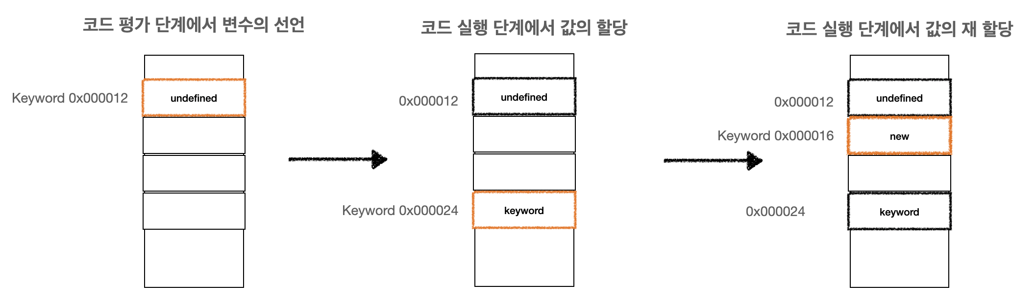 변수의 선언 단계에서 메모리에 공간을 확보한다. 변수의 선언은 코드의 평가 단계에서 진행되기 때문에 암묵적으로 undefined 값이 할당된다. 그 이후 코드의 실행 단계(런타임)에서 값의 할당이 이뤄지는데, 이때 변수의 선언 당시에 확보한 메모리 공간에 값을 할당하는 것이 아닌 새로운 주소 값에 값을 할당한 후 식별자가 해당 메모리 주소를 바라보게 된다.
