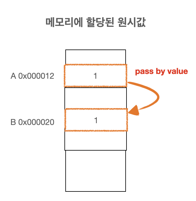 원시 값을 a 변수에 할당하고 b 변수에 a를 전달합니다. 이때 a의 값은 원시 값이기 때문에 call by value 값 전달으로 인해 실제 값이 전달됩니다.
