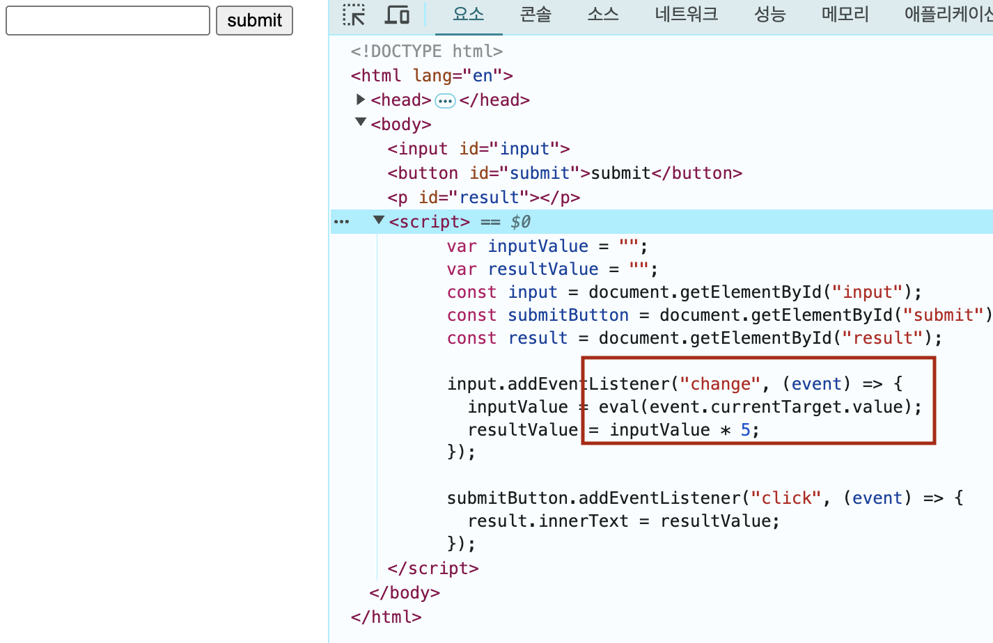 숫자를 입력하면 자연스럽게 우리가 의도한 값이 표현됩니다. 하지만 갑자기 나쁜 마음을 먹은 사용자가 이 기능을 망치고 싶은 생각이 들었습니다! 개발자 도구를 통해 소스코드를 살펴보니 input의 값을 eval 메서드로 처리하고 있다는 것을 확인합니다.
