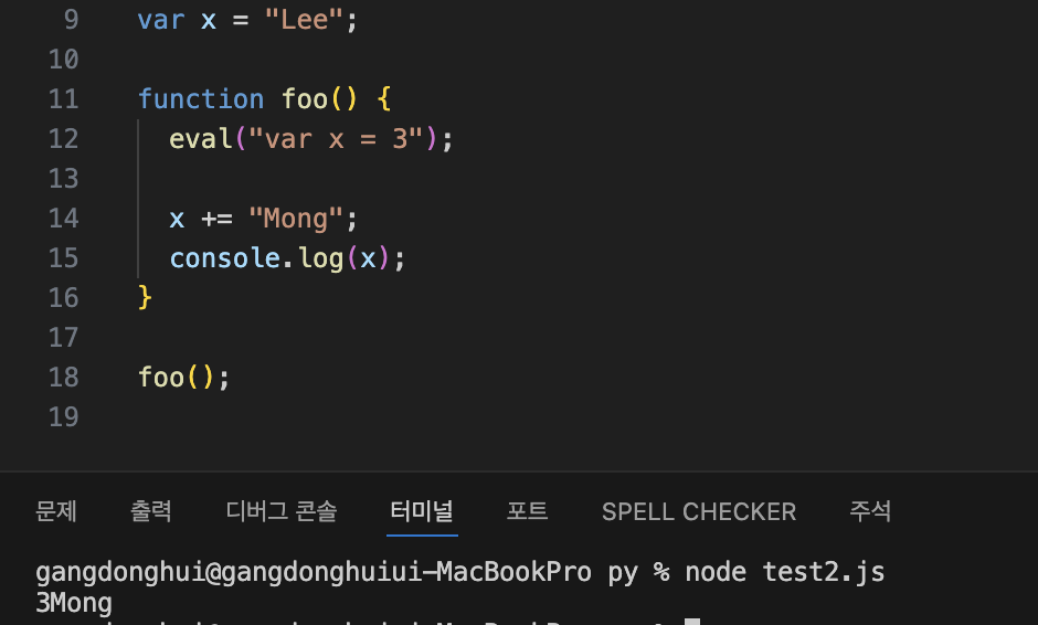 하지만 eval로 전달한 코드로 런타임에 x 식별자가 선언이 되고 값이 할당됩니다. 따라서 출력 결과 값은 기대하지 못한 "3Mong" 이라는 값이 출력이 됩니다.