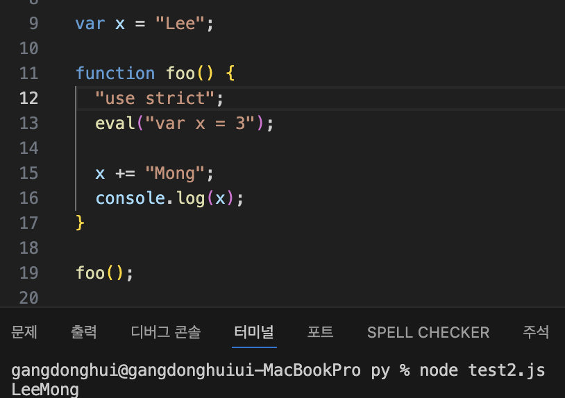 위 예제 코드의 foo 함수에 strict mode를 적용합니다. 그 후 코드를 실행하면 기대한 출력 값인 "LeeMong"이 출력되는 것을 확인할 수 있습니다. 실행 컨텍스트 관점에서 생각해본다면 foo 함수 실행 컨텍스트에 x라는 식별자가 등록이 되는 것이 아닌, eval 실행 컨텍스트에 x라는 값이 바인딩 됐기 때문입니다. 따라서 15행에서 x는 상위 스코프인 전역 스코프에서 x 식별자를 검색하고 기대한 출력 값을 확인할 수 있습니다.