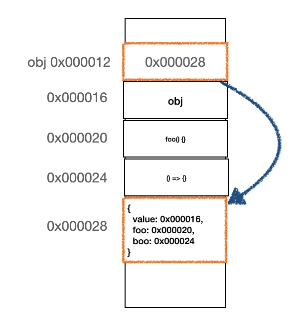 메모리의 구조를 살펴보면 다음과 같다. foo, boo 메서드는 obj 객체에 소유된 것이 아닌 각 프로퍼티가 메모리에 선언된 함수 객체의 주소를 가리키고 있다.