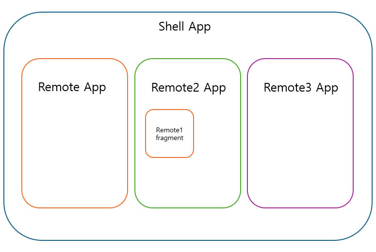 위 그림에서 Remote2 App은 Remote App의 Fragment를 Remote로 사용하고 있습니다. 이 경우에 Remote2 App은 모듈을 expose하고 다른 App을 remote로 등록하기도 합니다.