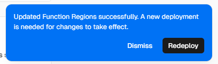 Function Region을 변경하면 우측 하단에 새로운 배포가 필요하든 알림 팝업이 등장합니다.
