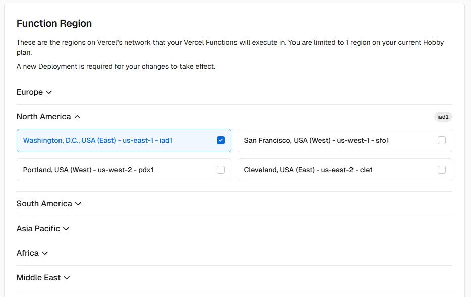 Vercel의 Hobby Plan은 Function Region을 하나만 선택할 수 있습니다. Edge Location을 통해 여러 리전에서 사용자에게 빠른 환경을 제공하고 싶다면 (CDN 사용) Pro 플랜을 이용하실 수 있습니다.