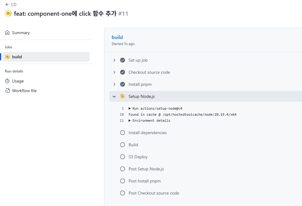 소스 코드에 component-two 파일을 생성한 후 커밋 합니다. CI/CD Workflow가 작동하고 S3 Bucket에 빌드된 결과물이 업로드 되어 배포됩니다.