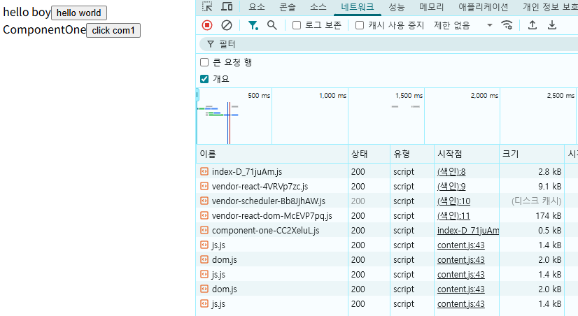 버튼을 클릭한 후 입니다. 컴포넌트를 랜더링 하기 위해 component-two chunk 파일을 요청합니다.